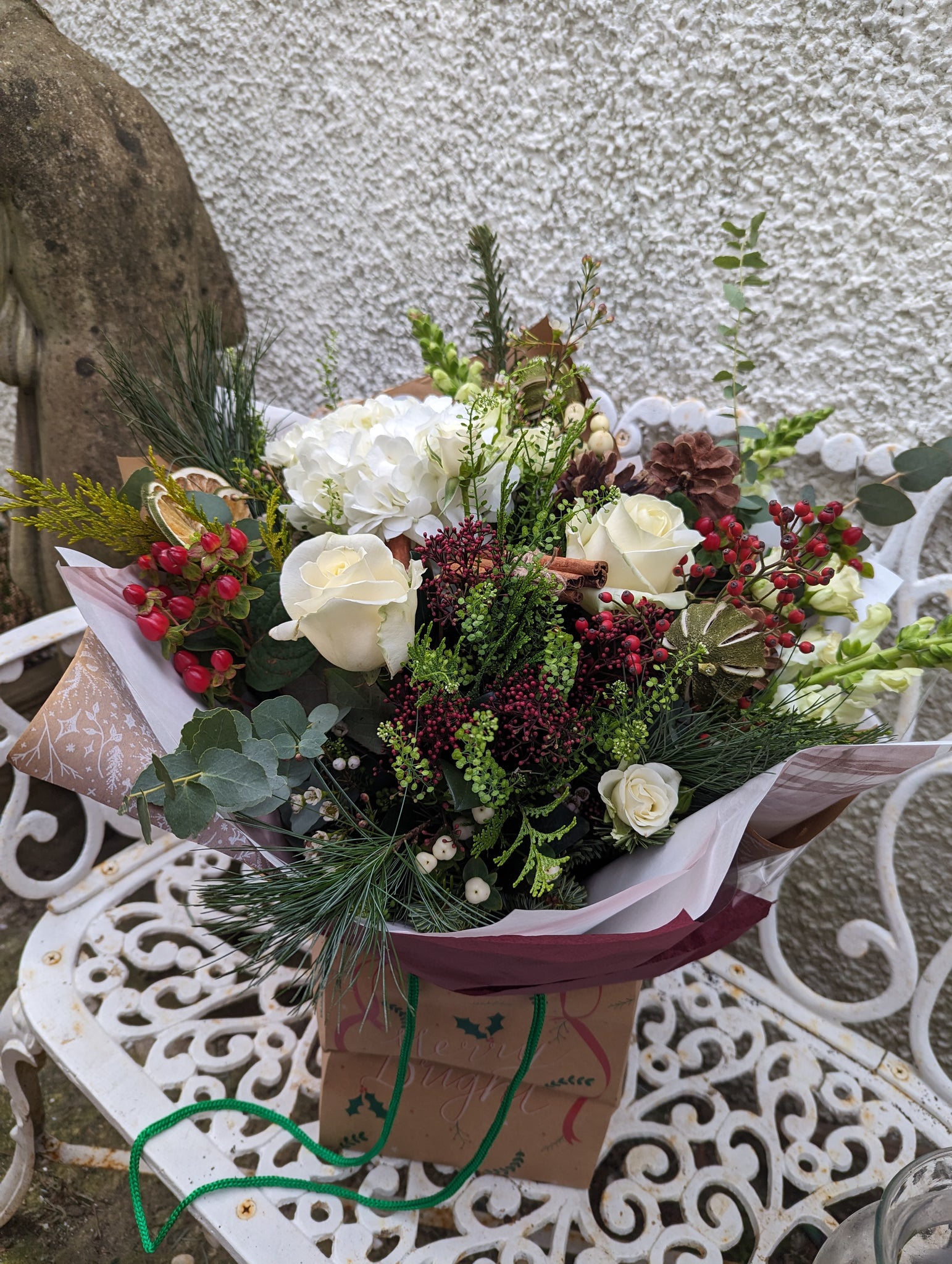 Our Christmas Elegance bouquet combines fragrant festive greenery, red berries scented dried fruits, pine cones, cinnamon bundles, Roses and seasonal white stems.