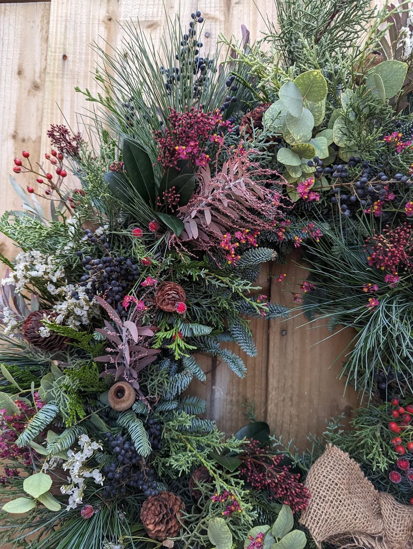 Introducing the Cottage Garden Christmas wreath. This luxury fresh Christmas wreath is handcrafted with an abundance seasonal foliage in tones differing from soft greens to deep reds, red berries, pine cones, statice and finished with a rustic Hessian bow.