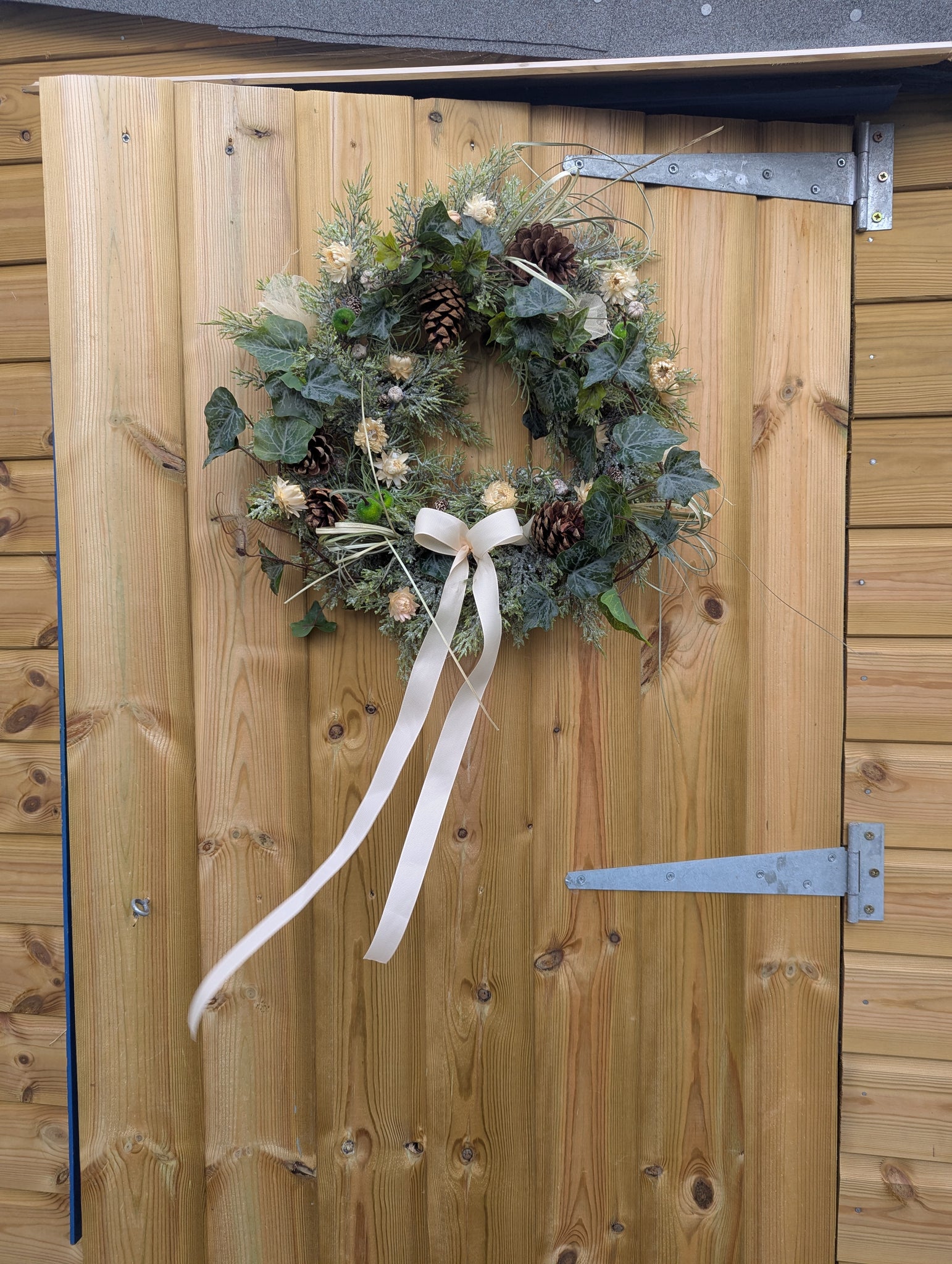 Introducing the artificial 'Woodland Ivy' wreath. This luxury artificial wreath is created on a wire base meaning it's versatile & lightweight to use on internal walls. Reccomend for indoor use (due to hot glue being used & dried elements).
