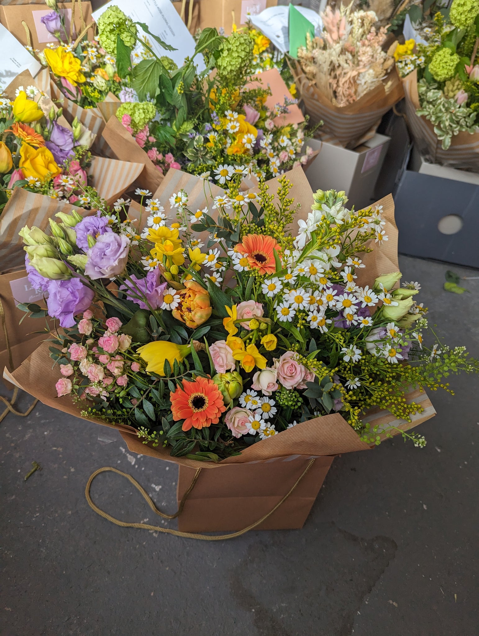 A joyful seasonal bouquet for Mothers Day, handcrafted by Little Rose Floral Design in Porthcawl, South Wales. Designed using a beautiful mix of bright and cheerful stems.
