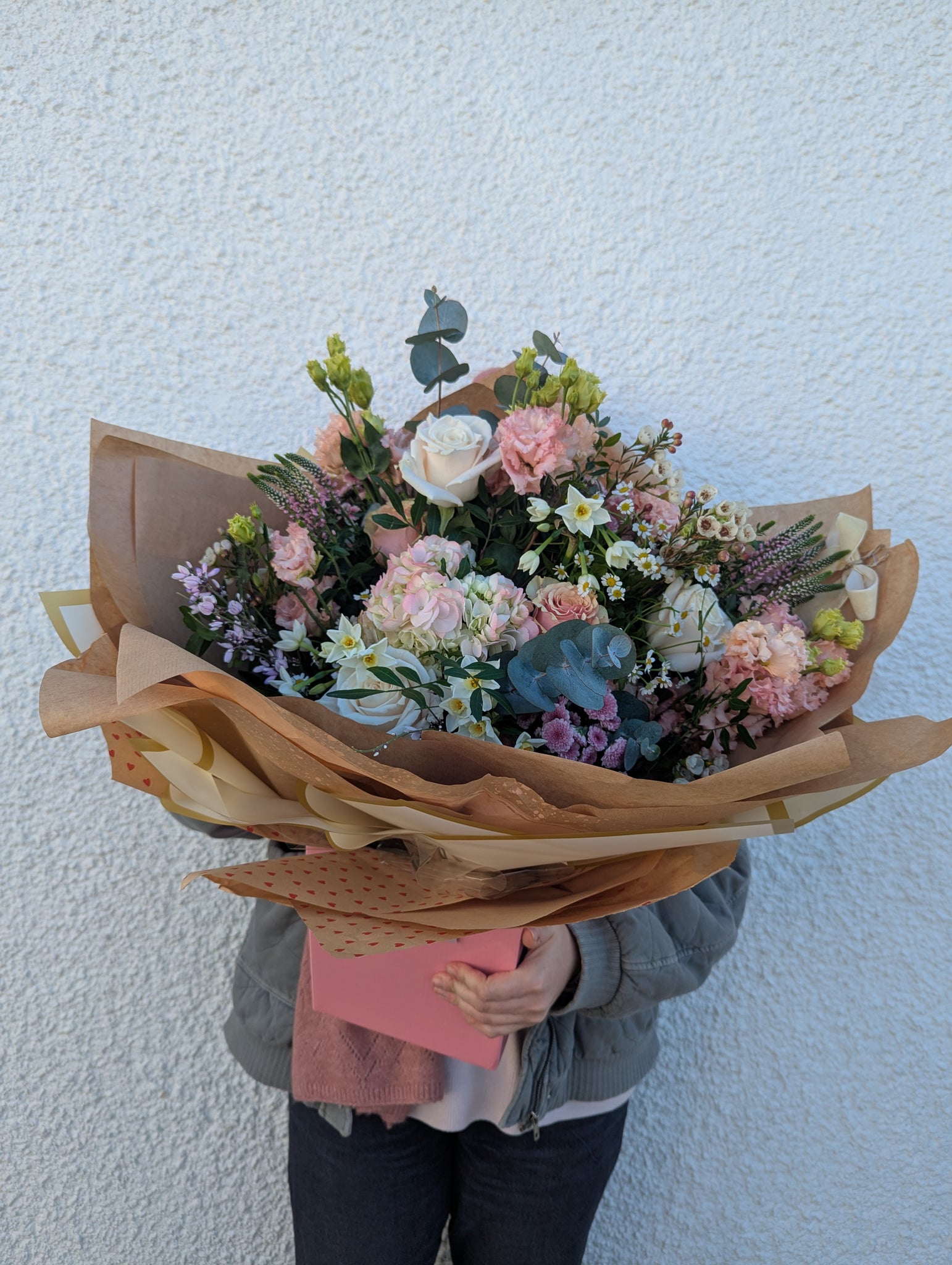 Available for collection on Friday 13th March or delivery Saturday 14th March 2026. Each arrangement is expertly styled with premium seasonal flowers and finished with elegant wrapping and ribbons. Due to seasonal availability, stems may differ slightly to the image shown.