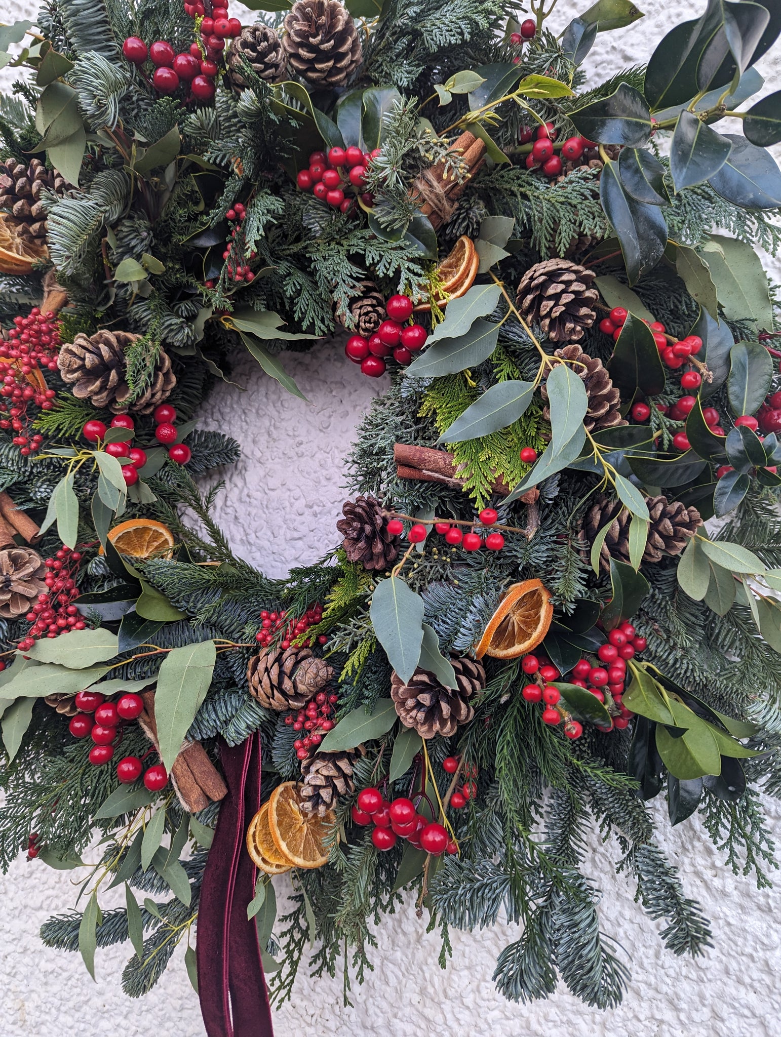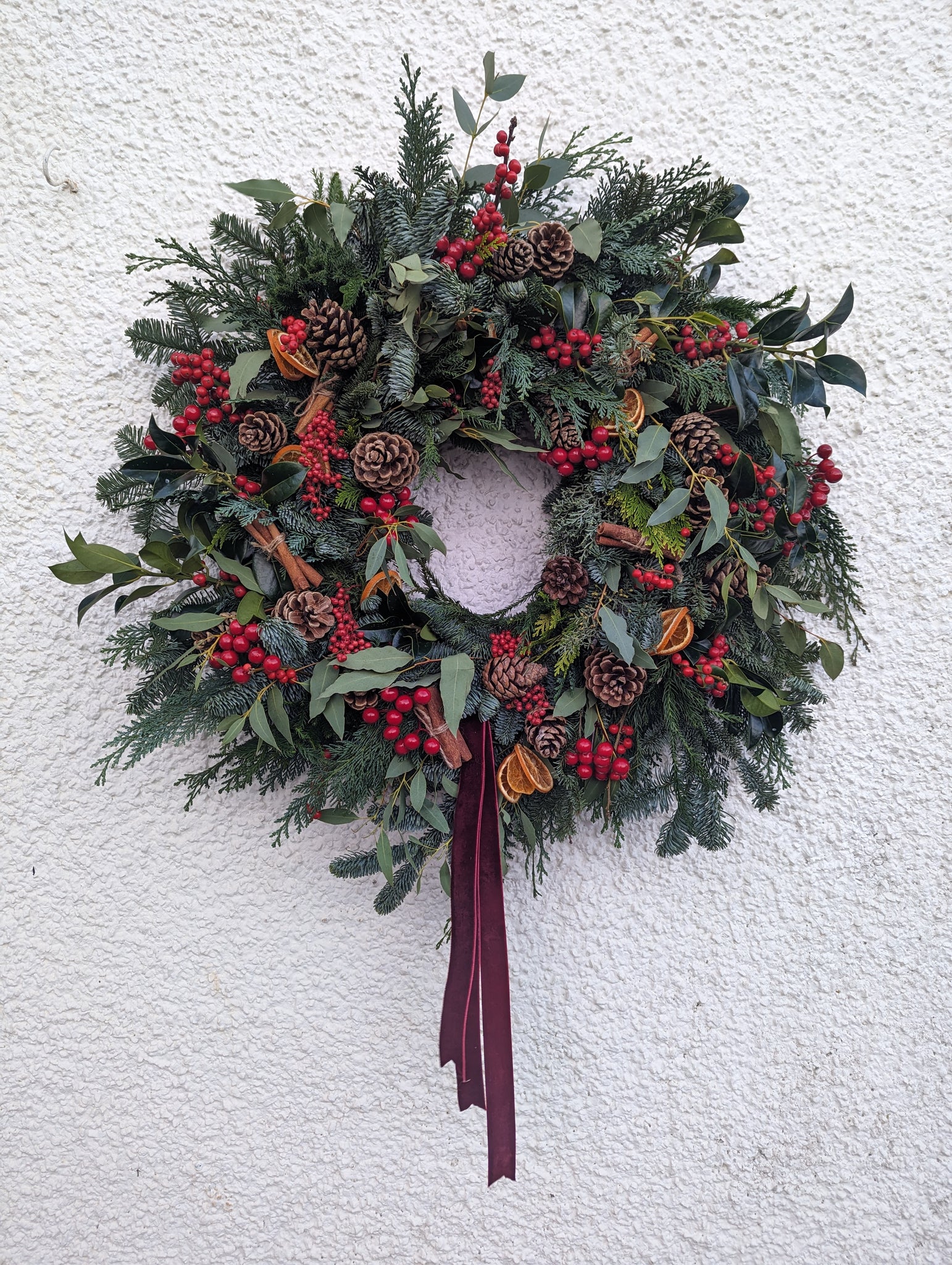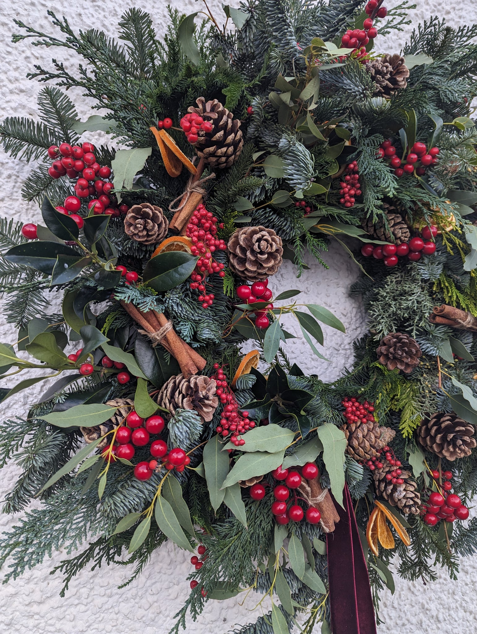 Introducing the luxury Traditional Charm wreath in a larger size, perfect for businesses/larger scale doors. This fresh Christmas wreath is handcrafted with seasonal fragrant foliages and features artificial red berries (perfect for business use as no drying over time), pine cones, dried fruits and cinnamon stick bundles.